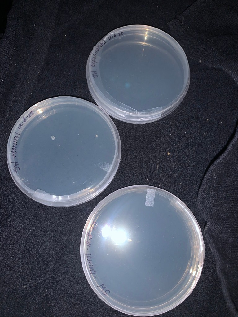 Referring to my lab notebook, the temperature in my house was typically 68-70 degrees Fahrenheit, recorded from my thermostat as I checked around 8pm every night over the course of 6 days, with a total incubation time of about 120 hours. From what was documented, and from analyzing the growth of the negative, positive, as well as experimental culture plates, microbe growth was not present. The appearance of any growth could not be seen. The results did not match my expected outcome as I predicted that the negative plate would have the least amount of microbes present, the positive would have the most, and the experimental would have a fewer amount. I would report my experiment and lab as failed, due to the lack of microbe growth, making results difficult to analyze and rely on since more microbes were supposed to appear in the positive control and did not. I believe that the reason my experiment failed, was because of the temperature of my incubation environment. Although the plates were placed near the back of the fridge for warmth, the temperature of my home in general remained to be a lower temperature, possibly preventing more accurate results. The final image of my experiment is below: